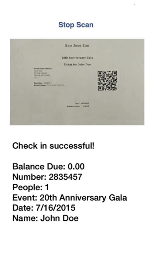 To check in an individual or a group using your iOS device, just launch the app, touch Scan and hold your iPhone or iPad over the QR code displayed on the printed ticket or on the ticketholder's smartphone. When you hear a beep, the person or group is checked in. Information about the ticketholder will be displayed so you can greet them personally or follow up on a balance due.