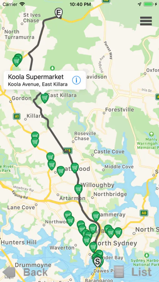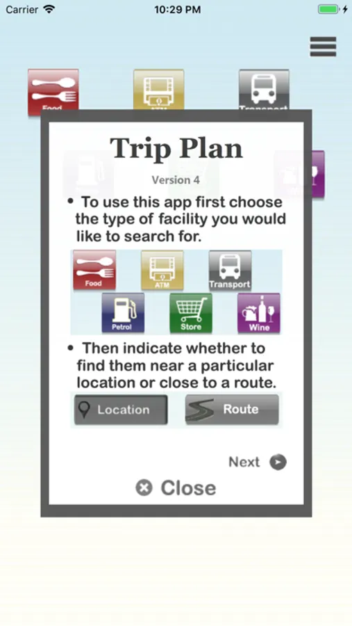 •Trip Plan is able to pin point your current location and find gas stations, ATMs and bank branches, food outlets, train stations, bottle shops and/or supermarkets within 2 kilometres distance.