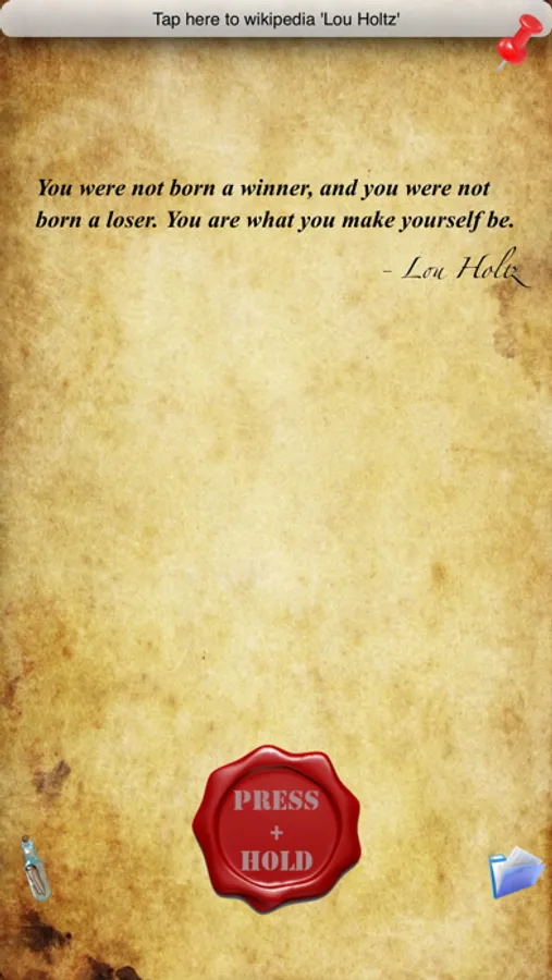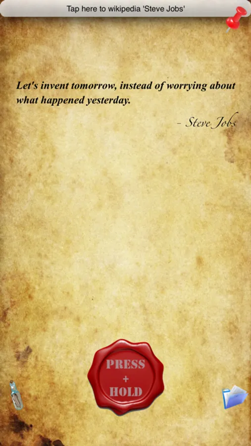 Hold the red wax seal to reveal your inspirational quote. Then save your quote by tapping the thumbtack in the upper right corner or view a bio of the author in wikipedia. View your saved favorite quotes over and over again anytime you want. You can share your quote by Email, Twitter, and Facebook.