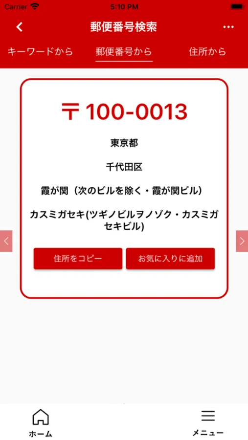 検索した郵便番号と住所をコピーしたり、よく参照する郵便番号データをお気に入りとして保存したりすることができます。