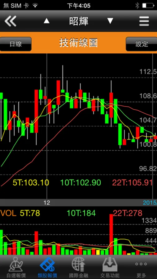 -技術線圖:支援5分鐘、60分鐘、日、周、月線圖,可觸控指標切換成交量、RSI、KD、MACD、PSY等技術指標,並切換橫置顯示。