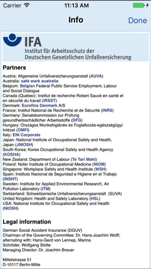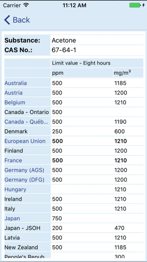 This database contains a collection of occupational limit values for hazardous substances gathered from 33 countries: various EU member states, Australia, Canada (Ontario and Québec), Israel, Japan, New Zealand, Singapore, South Korea, Switzerland, The People's Republic of China, Turkey, United Kingdom and the United States. Limit values of 2,343 substances are listed.