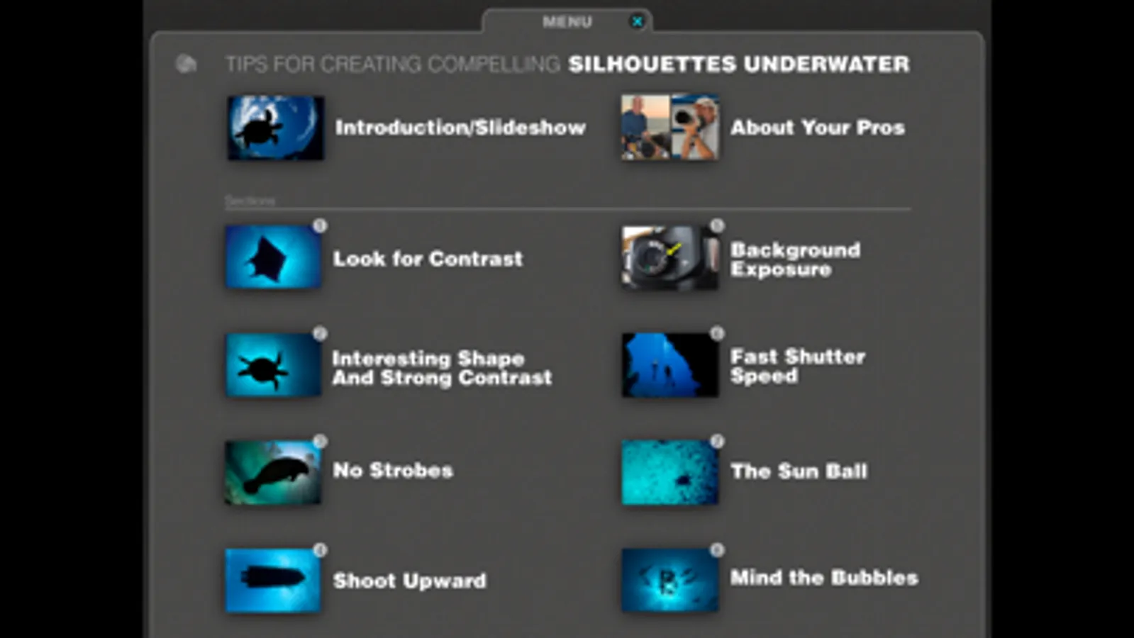 This App contains eight sections of training material with narration, and photos taken by David Fleetham and Marty Snyderman to illustrate examples of compelling silhouettes, plus other training slides.