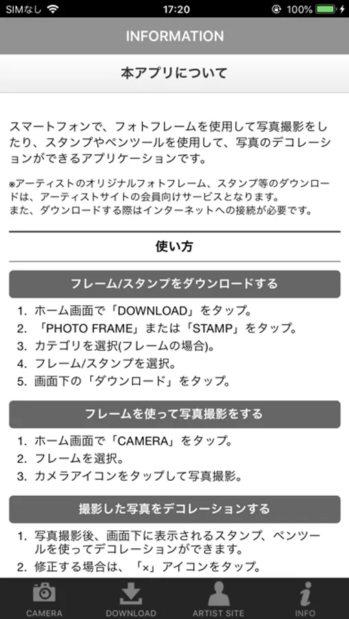 "ARTIST PHOTO FRAME" is the camera application which offers Japanese artists' original frames and stamps to decorate your photo.