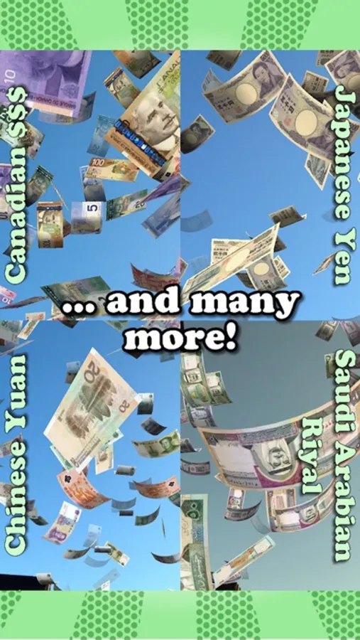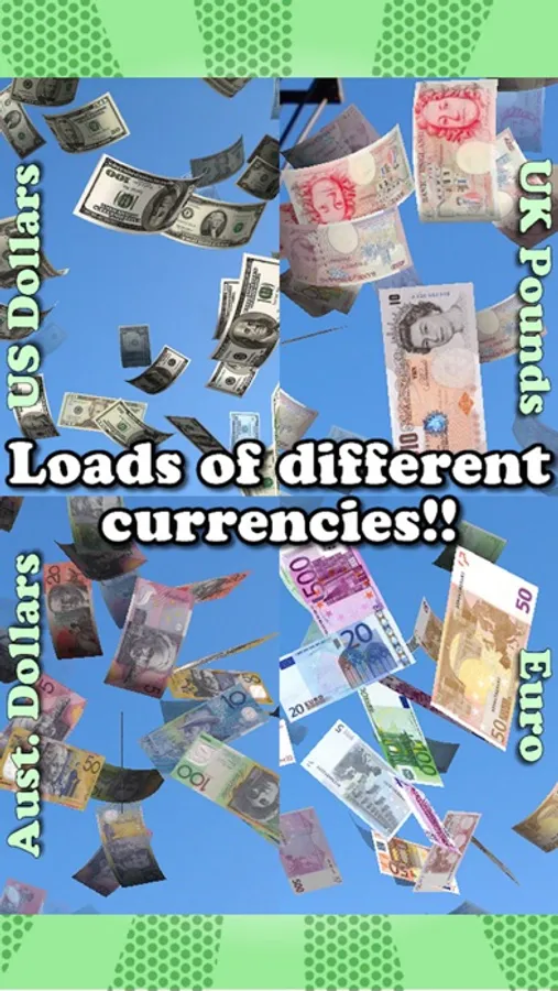 You'll see banknotes fluttering gracefully all around you in crisp, realistic 3D graphics! And thanks to Augmented Reality it actually moves when you move your phone, as if it's really there! Be a Billionaire for the day! Become the 1%!