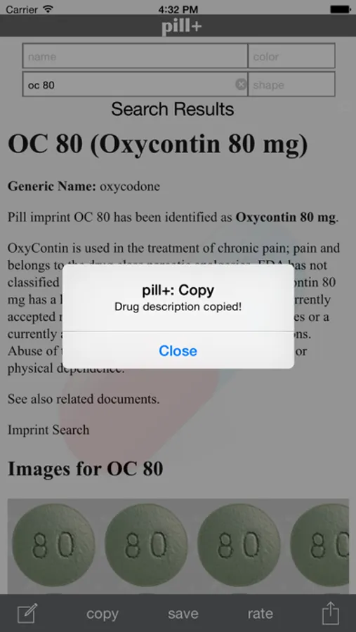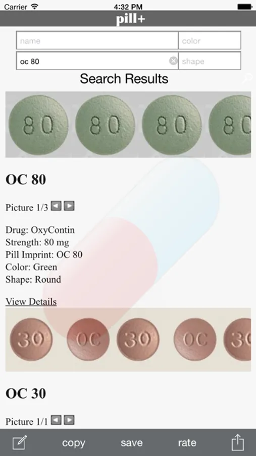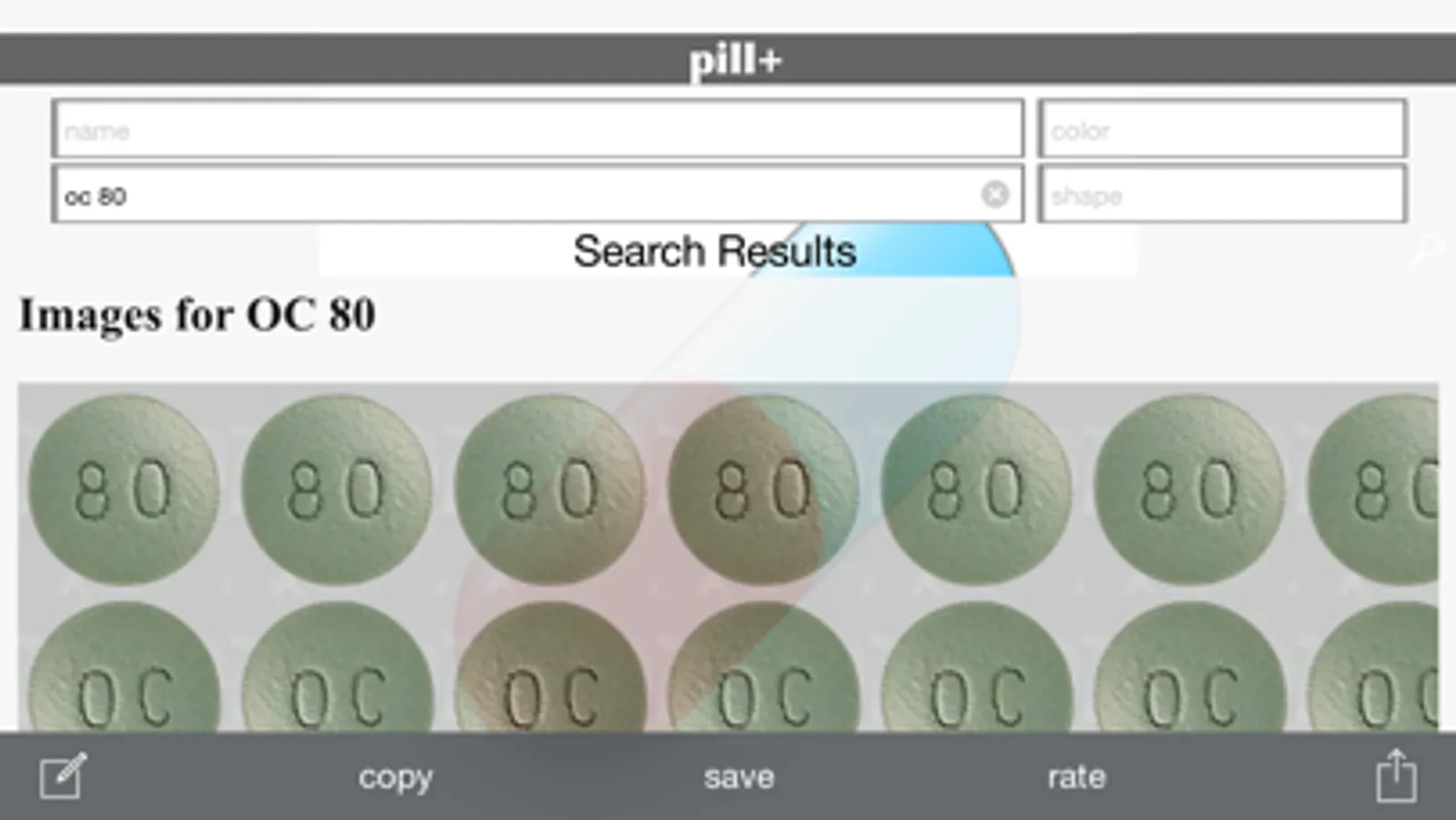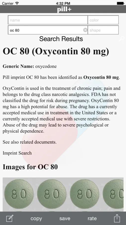 pill+ is a searchable database of pill images which includes more than 10,000+ medications. pill+ is your resource for identifying pills, and viewing images. You can input search based on imprint, drug name, color and shape. The app requires an internet connection to view the various pill images. You can also save rendered pill output images to camera roll.