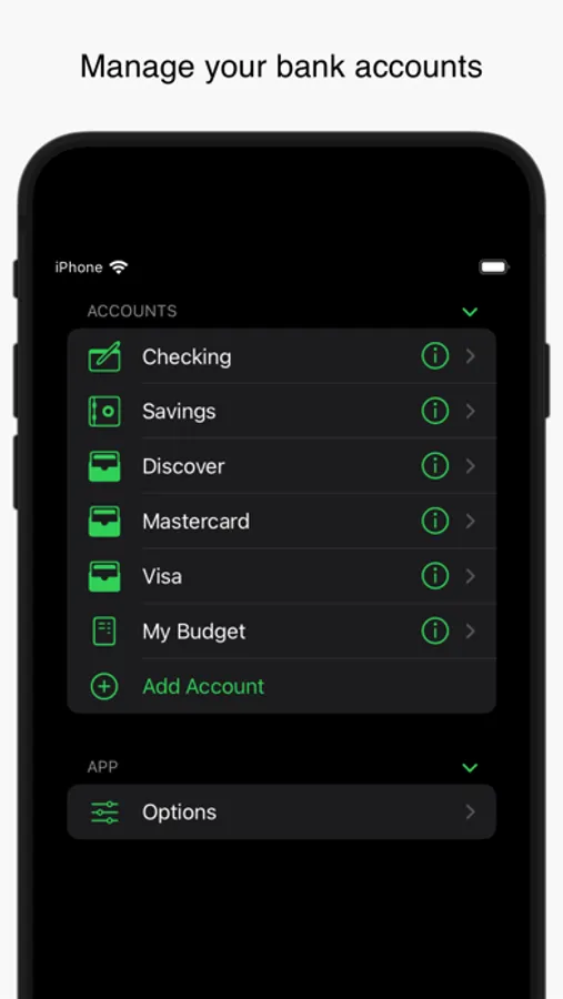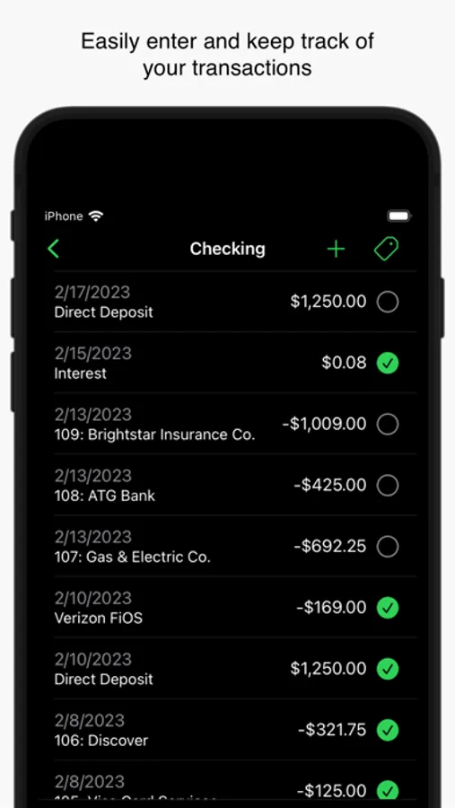With Finance you can enter and keep track of all of your checking, savings, and credit card transactions and create and manage a budget.