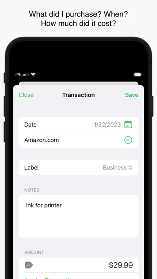 Finance makes it easy to add new transactions by only asking for relevant info based on the account and transaction type and makes data entry a breeze with time-saving description labels and categories. Finance can create some default labels to get you started. Don't have the right label for a transaction? Just select “Add Label” at the bottom of the menu to enter and assign a new one. When it comes to entering an amount, simply type it in, or you can use an itemize list with multiple amounts that total for you.