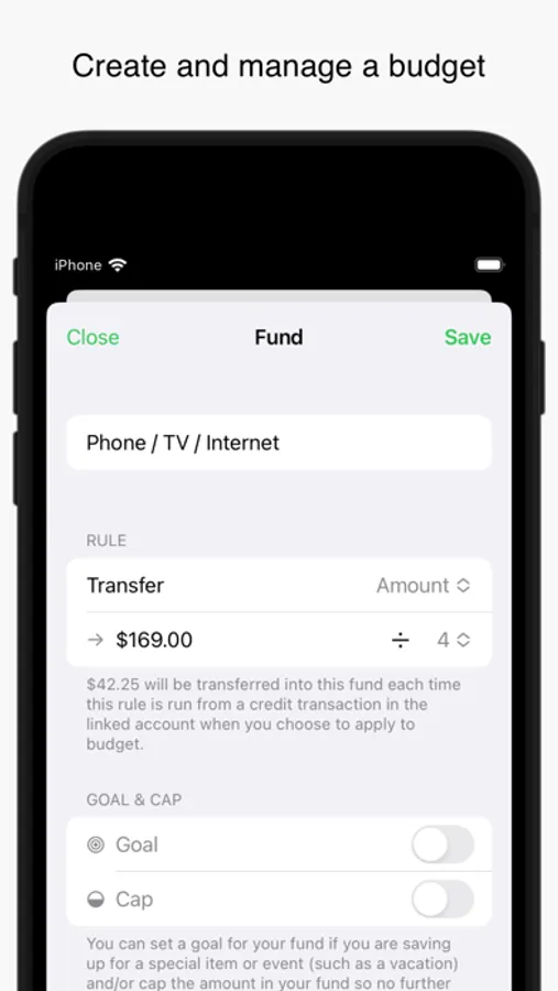 Finance enables you to easily create a budget linked to a checking or saving account to help you manage your money. When you do so, Finance generates a “General Funds” budget item and places the current amount available into it. You can create funds and enter the amounts for monthly bills. Use the divide by feature to take out a smaller portion of your income as you build toward the total due. Once you cover your expenses, you can also set up funds to take out a percent of whatever remains if you're saving up for something special. You can also set a goal you would like to reach and even cap the total the funds can hold.