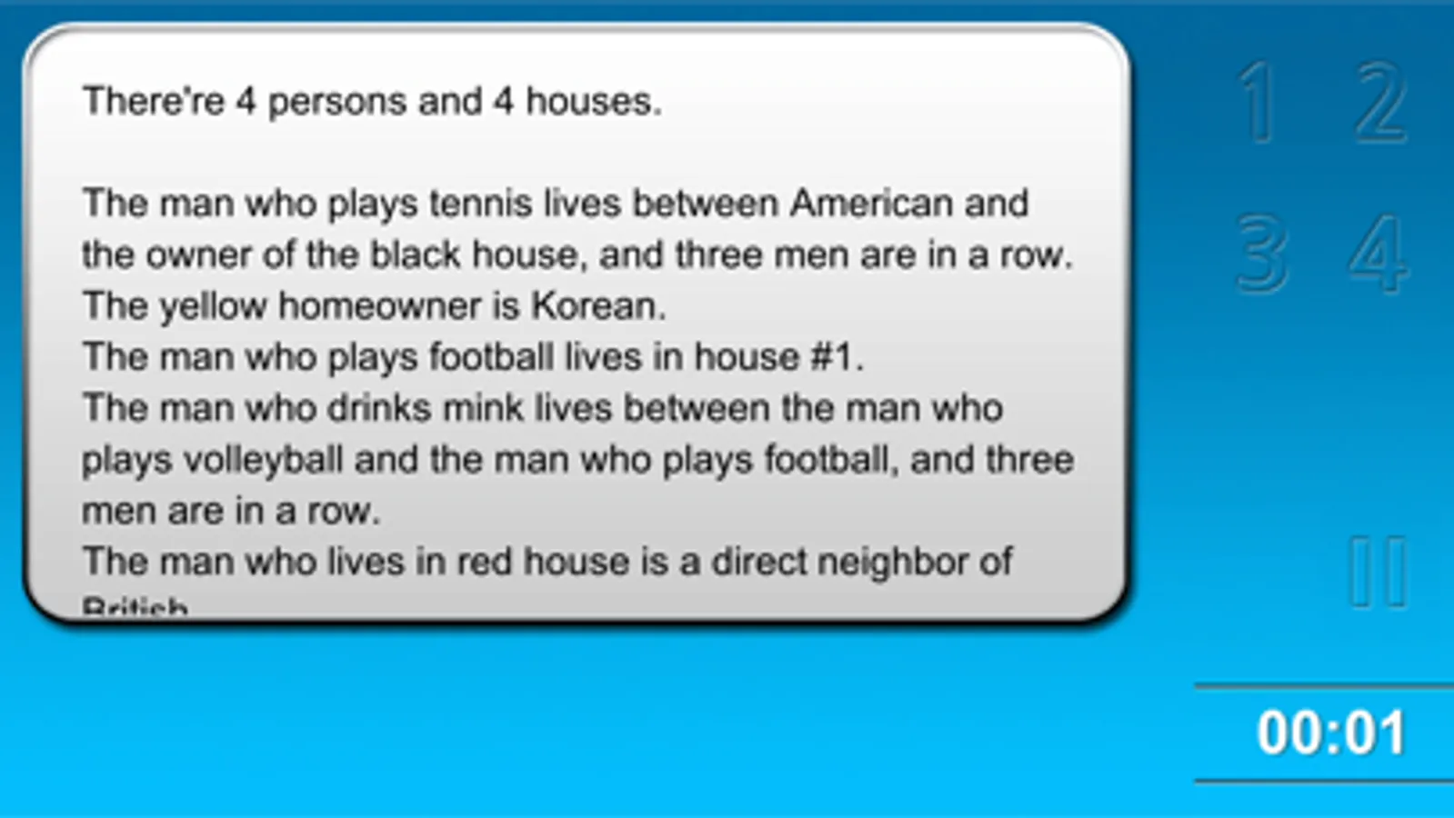 Zebra Puzzle ,aka Einstein's puzzle, is a logic puzzle.
