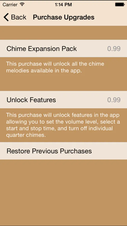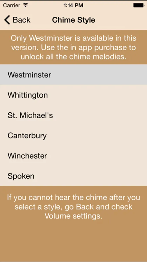 Using the iOS notifications feature, Westminster Chimes converts your phone into an old fashioned hourly chiming clock, playing the traditional Westminster Chimes tune. With an optional in-app purchase, you can unlock additional chime melodies: