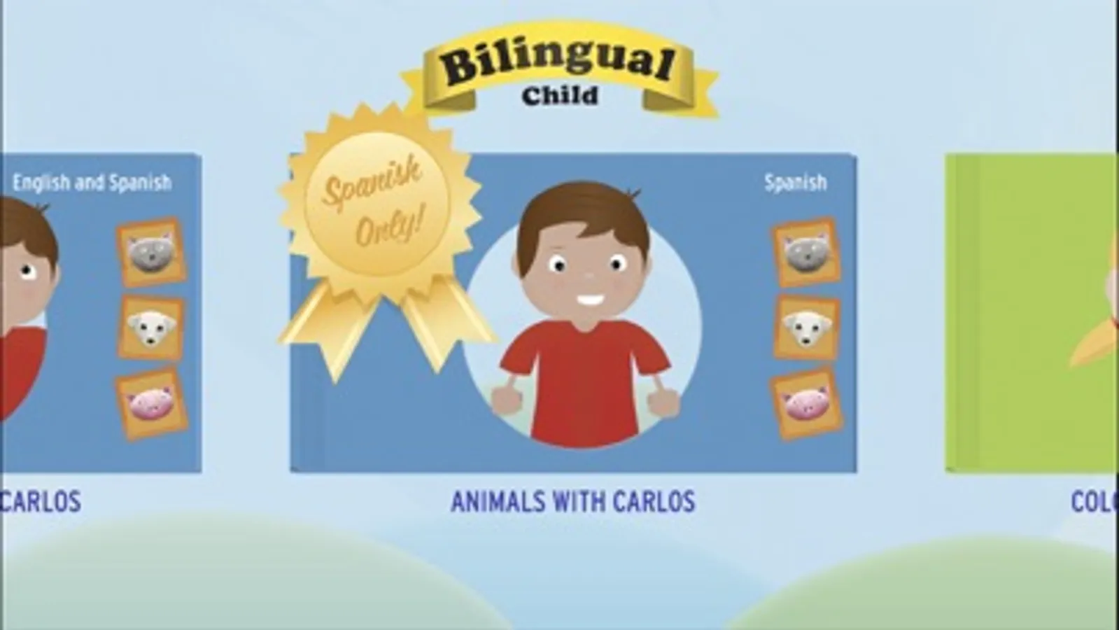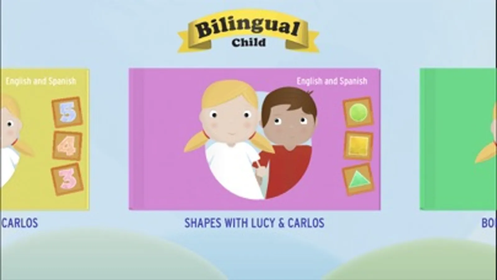 Bilingual Child will submerse your child into animated books where characters Lucy and Carlos, an English-speaking girl and a Spanish-speaking boy, teach vocabulary. Engaging animation reinforces the word spoken by the characters as does a word bubble in each language that appears above the character’s head.