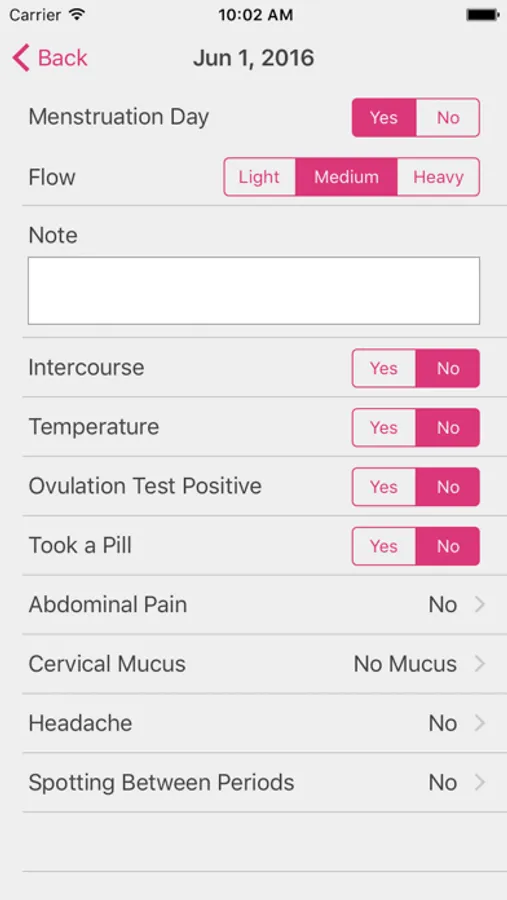 • Text notes (e.g. about period, taken medications, mood, friends) may be attached to each day.
