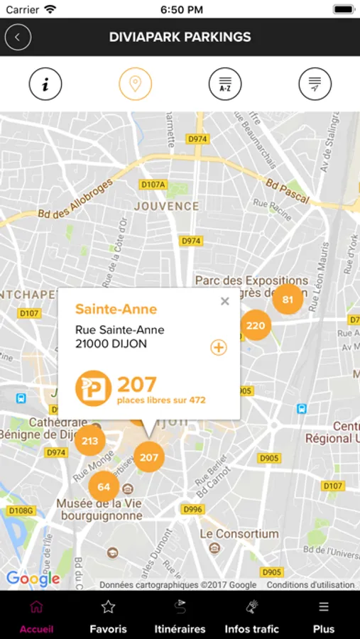 - Localisez les 9 parkings de la Ville de Dijon sur la cartographie et visualisez les places libres en temps réel