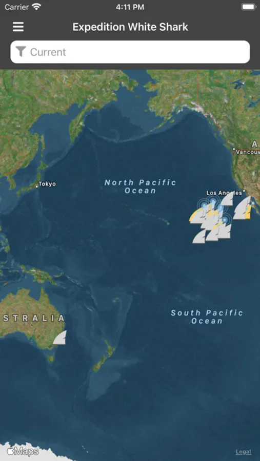 Use the shark filter to select a specific shark or see the last position for all sharks of a specific species, or select current to see shark positions within the last 30 days. If current is selected the last position for a shark that appears on the map as a dorsal fin , while sharks with historical location data on today’s date in previous years are marked with dot. This allows users to look for patterns of where sharks may be found during that time of year.