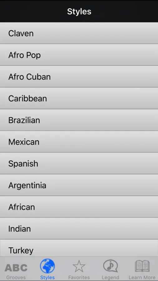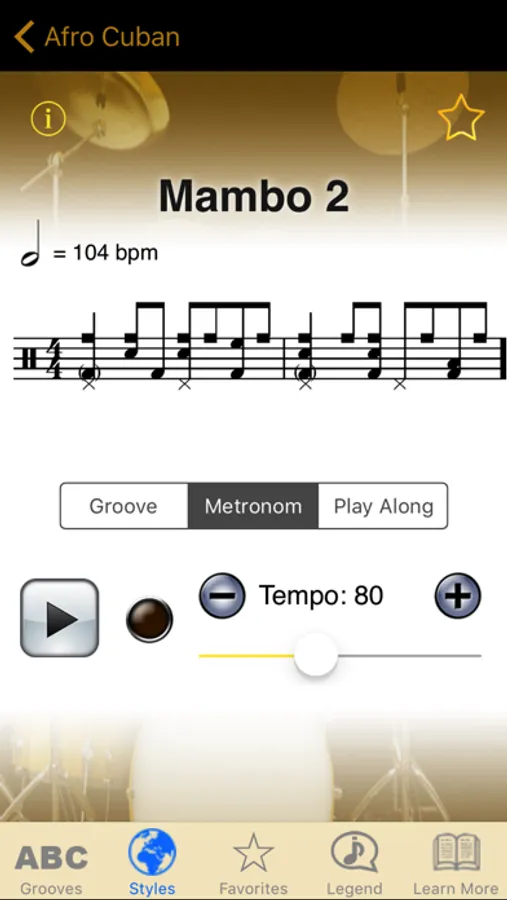 You can simultaneously listen to a rhythm and see its notation. You can make a screenshot to print the notes. The i – Button will take you to the most important historic information, like roots and the most relevant artists in the genre. The other page takes you to the musical info, like song structure, instruments, beats and tempos.