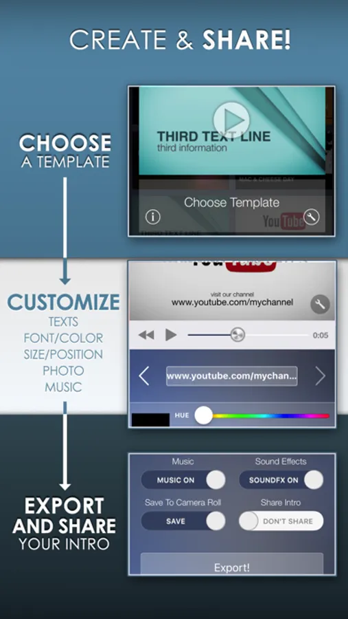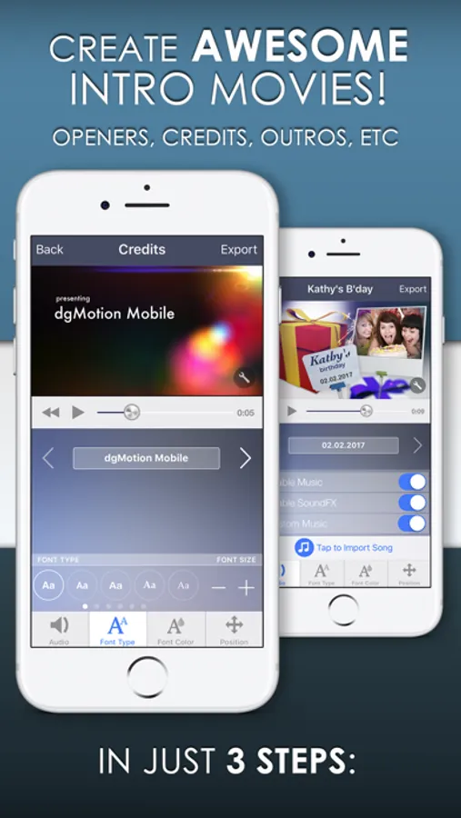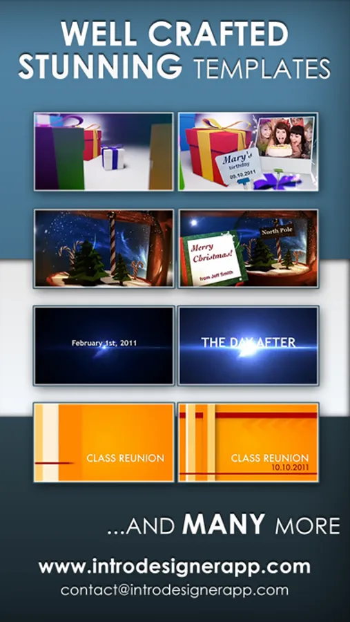 Make beautiful HD intro movies, openers, end credits, announcements and more, using our professional and stunning templates. In just three steps: Choose - Customize - Export , you can create special intros and then join with your videos using your favorite video editor. Easy like that.