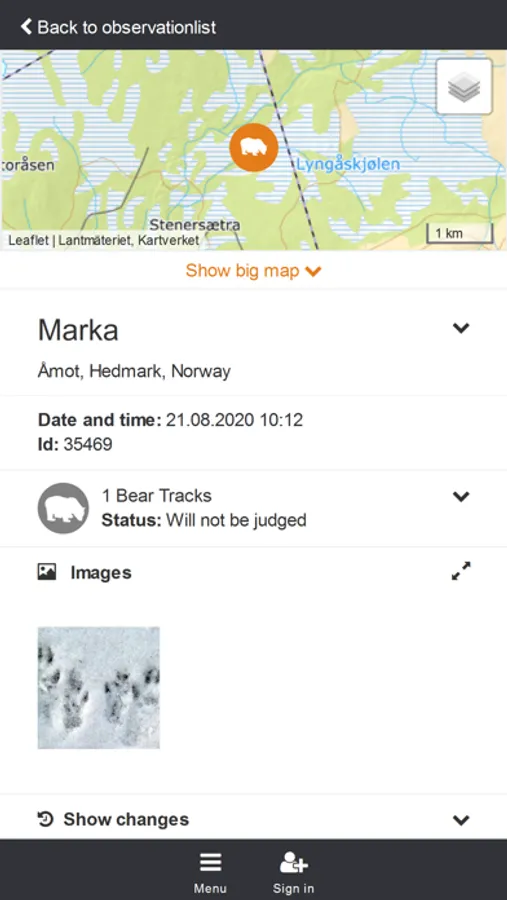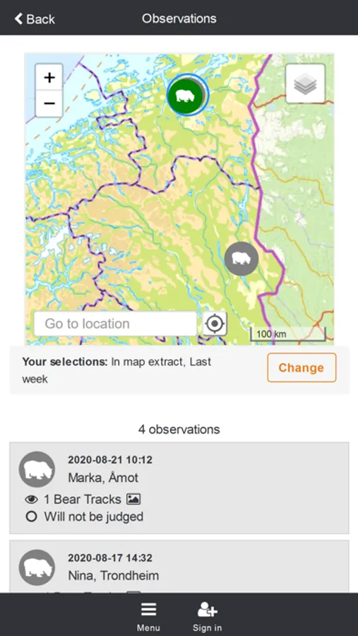 In Skandobs, everyone can report their sightings of lynx, wolverine, brown bear and wolf. In this way, the public can contribute to knowledge about the distribution and number of predators in Scandinavia. The County Administrative Boards in Sweden and The Norwegian Nature Inspectorate (SNO) in Norway are responsible for the annual field registrations of the species. In the registration work, reports on predators from the public are important in order to obtain as comprehensive a registration as possible. In order for a report to be included in the result from this year's registration season, it is usually required that the county administrative board or SNO visits the site, verifies the information and possibly adds more information. If an observation registered in Skandobs is particularly important for the monitoring of the species, an automatic notification is immediately sent from Skandobs to SNO or the county administrative boards. Read more in Skandobs about which observations are particularly interesting for the monitoring program.