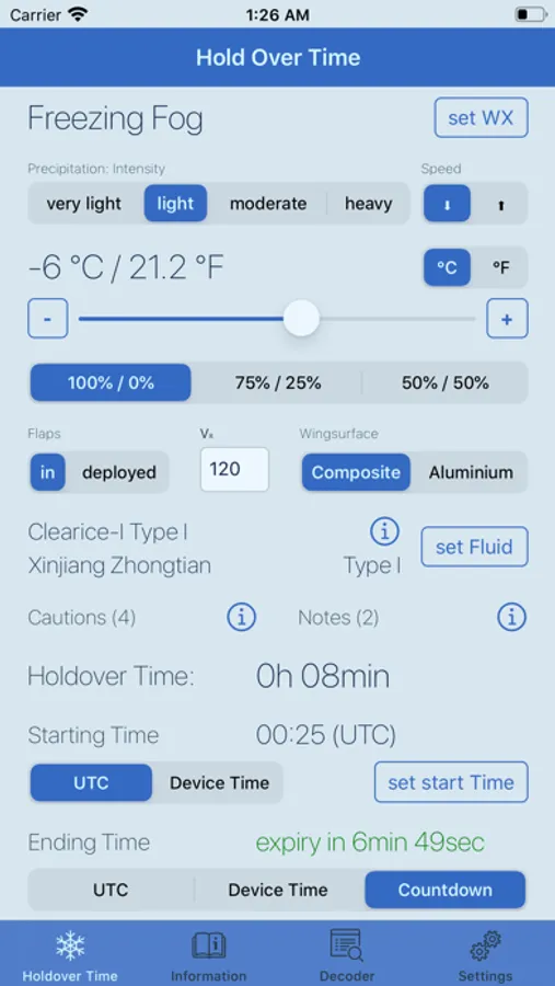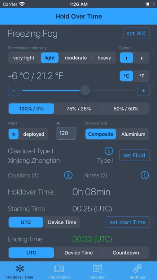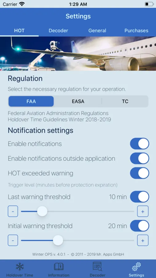 NOTE: This Application reflects general recommendations only and local airworthiness agencies’ rulemaking and guidance as well as aircraft manufacturers’ documentation must always be followed. As individual icing situations or aeroplane types/models may require special procedures, this application can never replace the responsibility of the aeroplane operator’s judgement. The responsibility for the correct de-icing/anti-icing of aeroplanes always stays with the operator of the aeroplane. Although great care has been taken by the developer, errors or misprints can occur for which neither the developer nor the FAA/TC (information source) can be held liable. The developer or the FAA/TC (information source) do not accept liability for any damage, personal injury, death or any other negative effect that may result from the use of the information contained in this application as a whole or parts thereof.