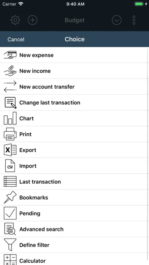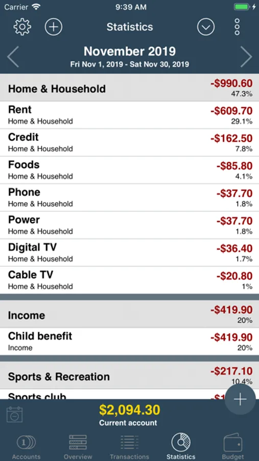 A housekeeping book cannot be easier. The surface is kept simple on purpose and provides all features you will need for the management and analysis of your finances. No more, no less.