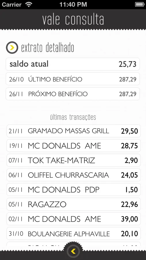 Vale Consulta is the easiest way to check the balance and summary of your favorite meal card, also see last transactions, past and next recharge.