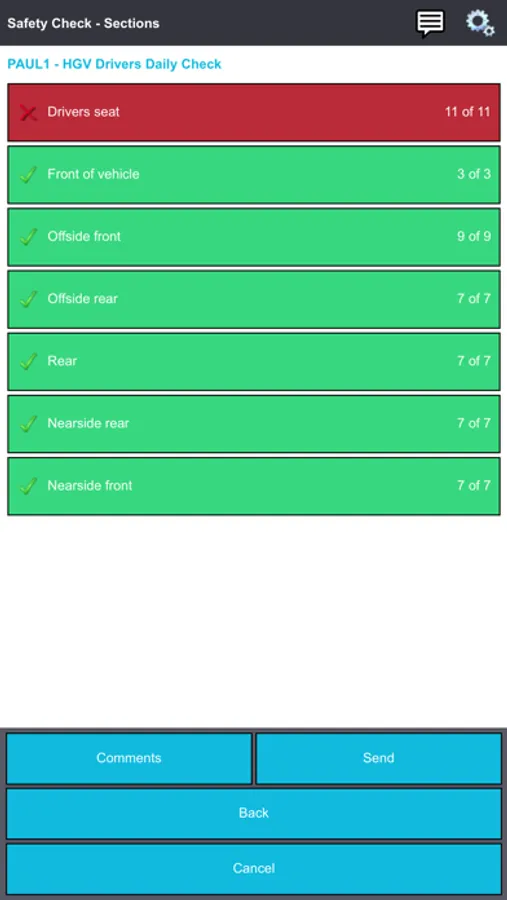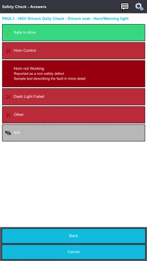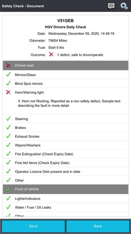 Defects are reported immediately through to the responsible supervisor via email. A full history of each check is kept on the vehicles Truckfile record and chosen workshops can be alerted automatically to the need for any repair. A weeks worth of checks are kept for reference on the hand held reader.