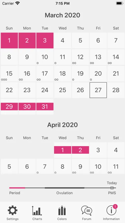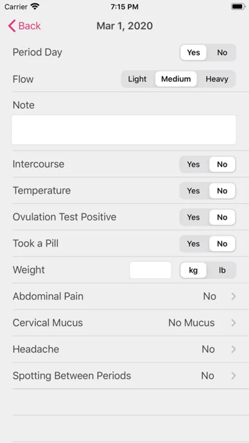 • Text notes (e.g. about period, taken medications, mood, friends) may be attached to each day.