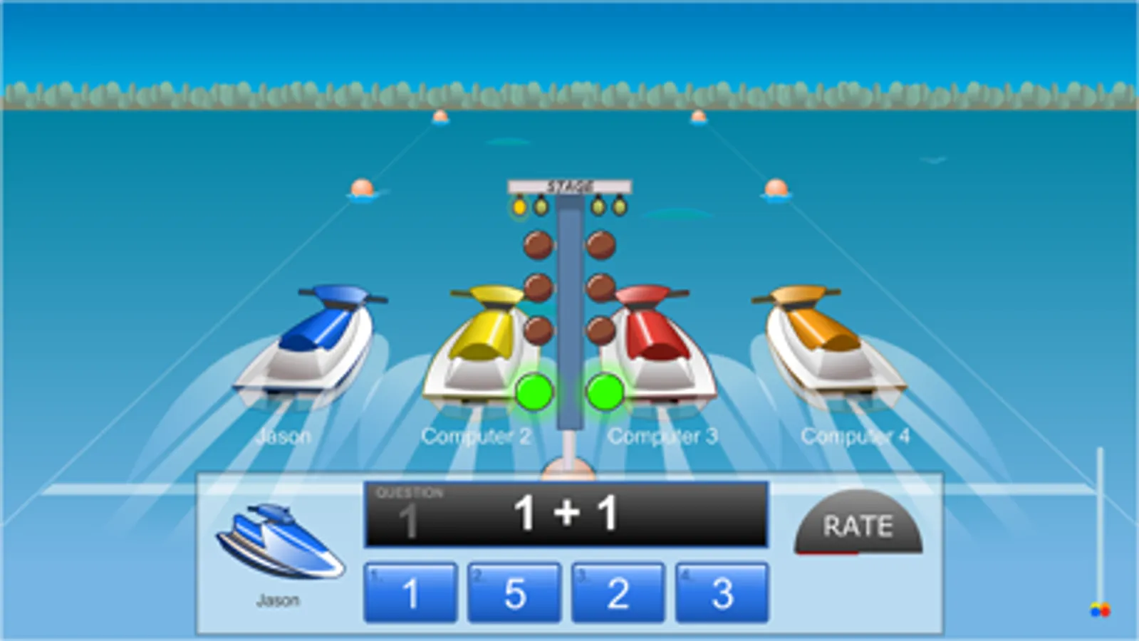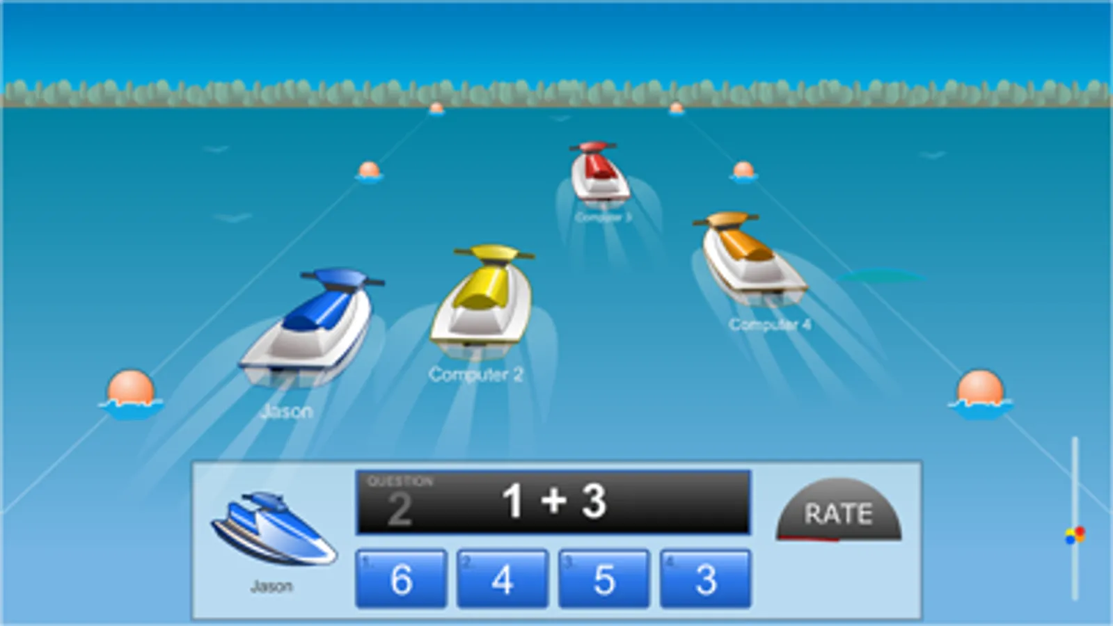 Jet Ski Addition is a multiplayer racing game that allows students from anywhere in the world to race one another while practicing their addition facts. Your jet ski's speed is determined by how fast you answer the addition problems.