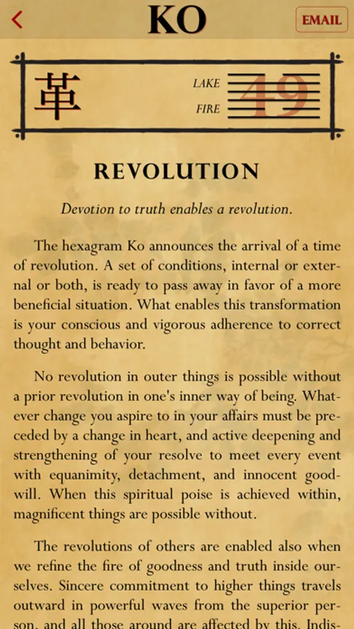 This lite version contains the I Ching consulting tool and complete odd-numbered passages. Additional content and emailing feature is available through an In App Purchase.