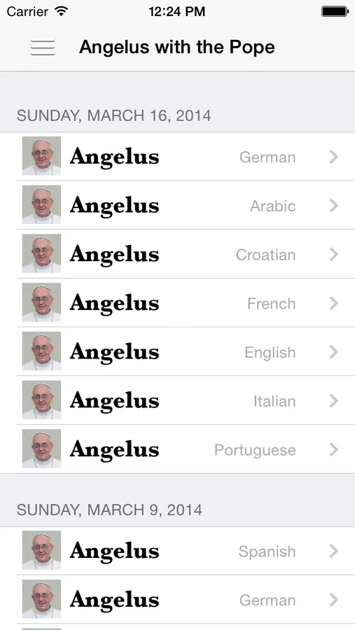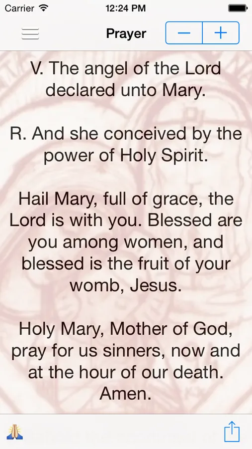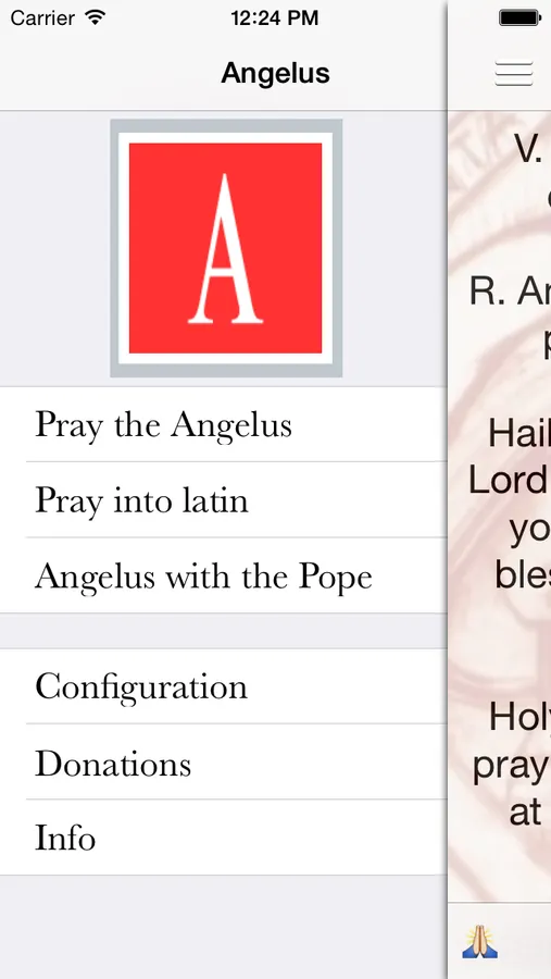 This application allows the Angelus prayer in both your language and Latin. Furthermore, the application notifies you at 12 PM to remind you when to pray the Angelus.