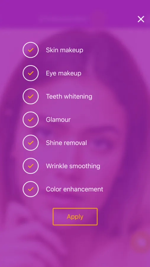 * Skin makeup (skin smoothing, including removal of face shine, imperfections and wrinkles)