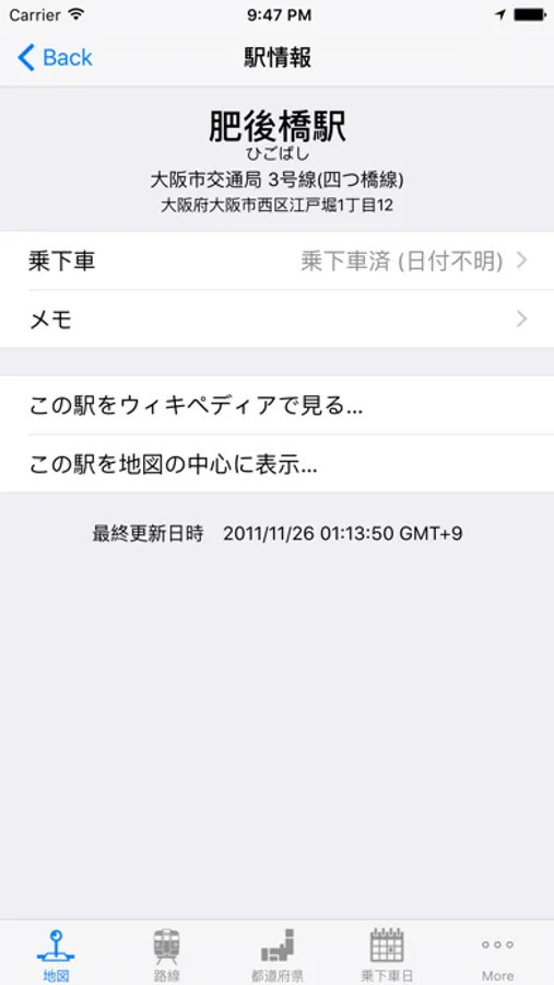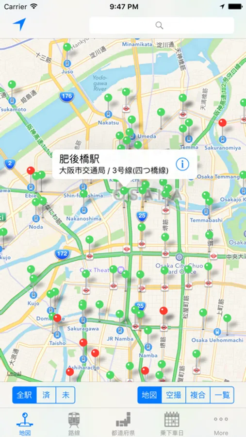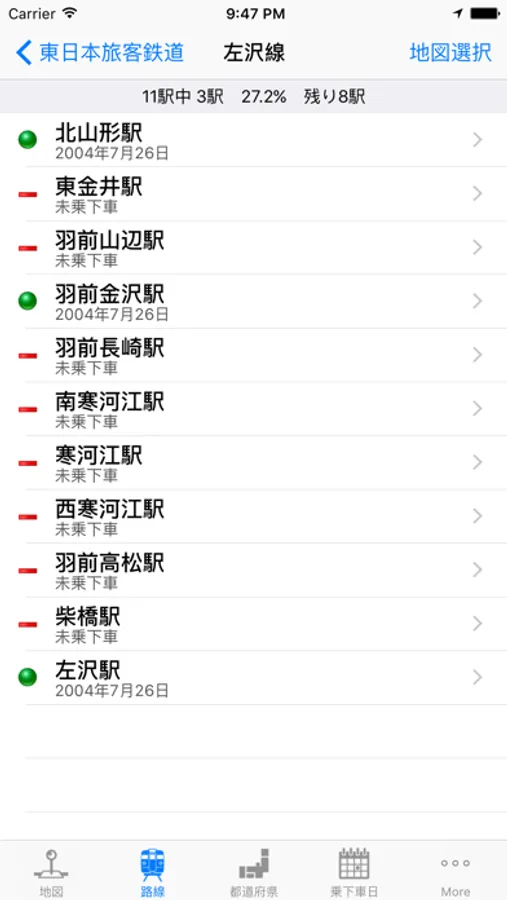 地図から、路線一覧から、都道府県別一覧から、さらに読みから駅の一覧を表示し、乗下車した日付を記録できます。