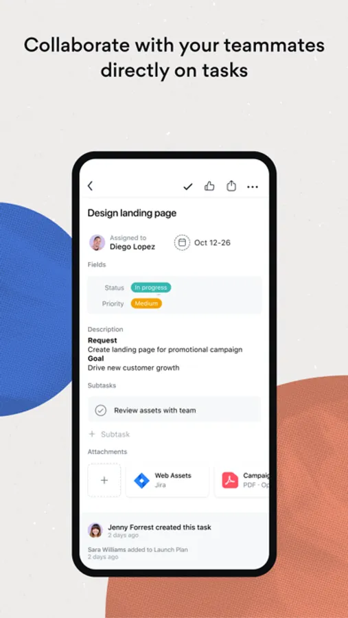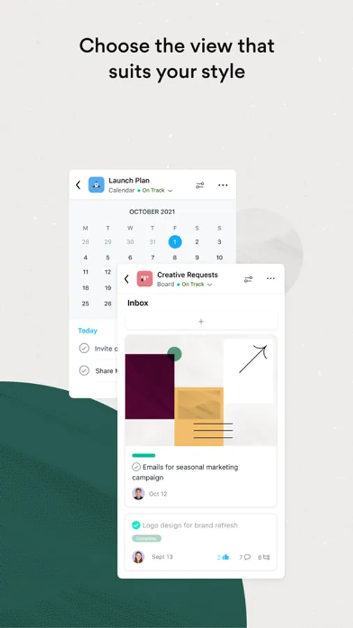 Set up different projects to bring your team’s work together in one shared space. Break the workload down into manageable tasks and give them a clear owner and due date. Choose a project view that suits your style—lists, kanban boards, or calendar.