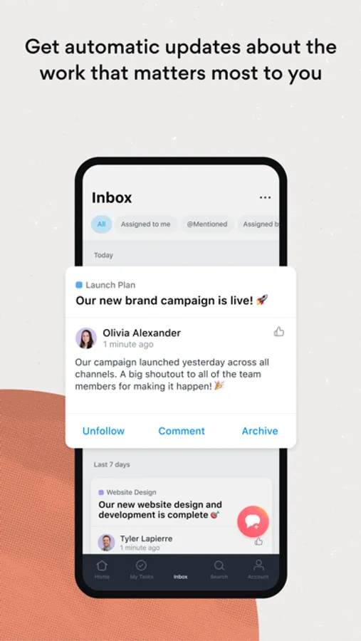 Keep collaboration going, wherever you are. Communicate with your teammates by liking, commenting, or attaching files directly to tasks. And get automatic updates about the projects and tasks that matter to you delivered directly to your Inbox.