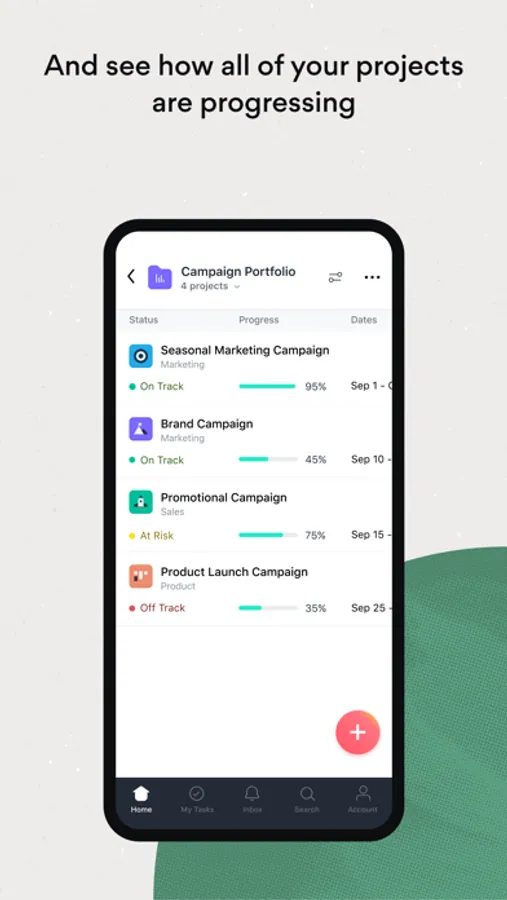 Visit the web app to see how all of your projects are progressing with Portfolios. Personalize task management with Custom Fields to capture important information about your tasks. Choose timeline view for projects to see a Gantt chart with task dependencies. And unlock the ability to track company goals and milestones with Goals.