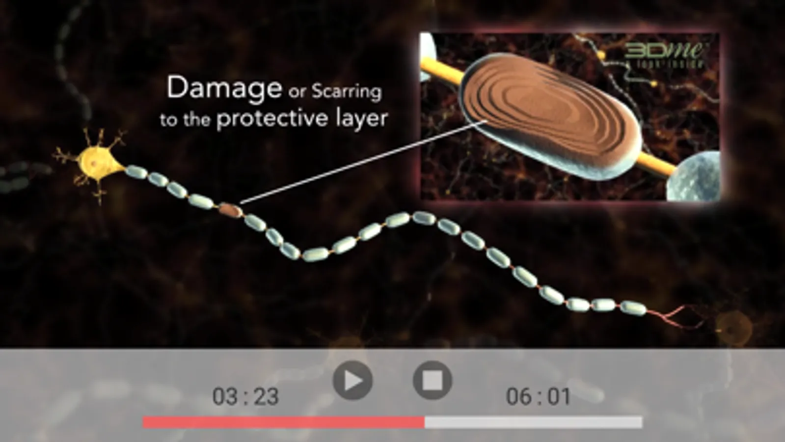 The central nervous system (CNS), which consists of the brain, spinal cord and optic nerves, is affected by Multiple Sclerosis. Using high definition 3D visualisation and multimedia we take a look inside the human body at the nerve cells in the CNS to explain the sclerosing or scarring of the myelin sheath covering the axon of the oligodendrocyte (nerve cell). This sclerosing causes the transmission of nerve impulses to be slowed or dissipated.