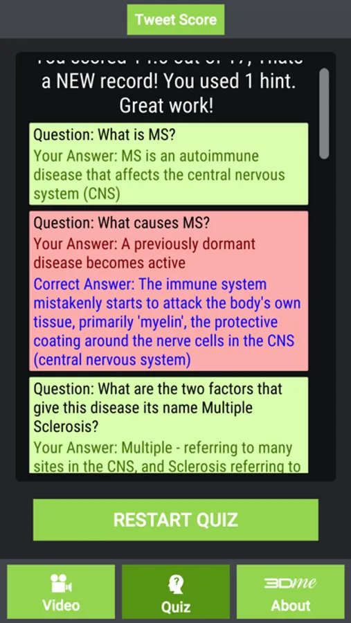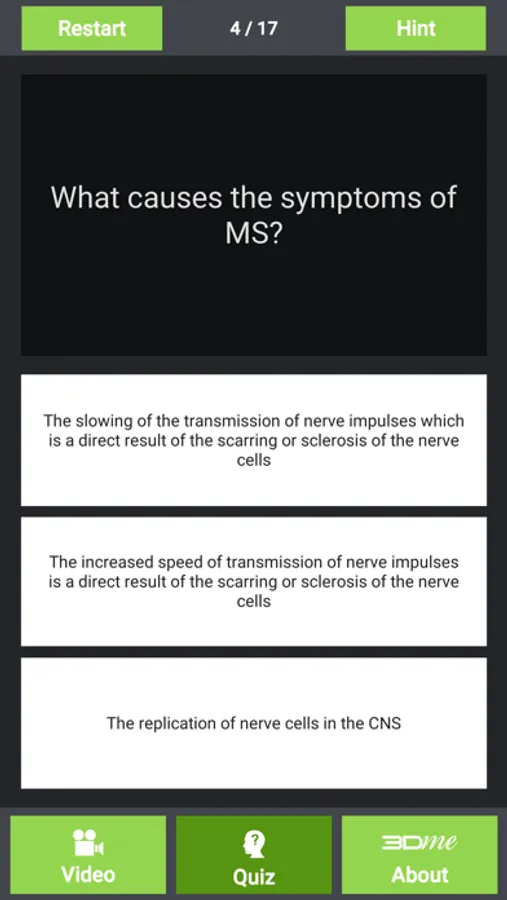 The video in this App was specifically created for people newly diagnosed with Multiple Sclerosis. The objective of the video is to help those diagnosed with MS, their family, friends, parents and teachers to understand this disease better. An improved understanding of this disease will hopefully alleviate some of the anxiety newly diagnosed people have about their diagnosis. This App also has a series of questions and answers and users are encouraged to share and tweet their results.