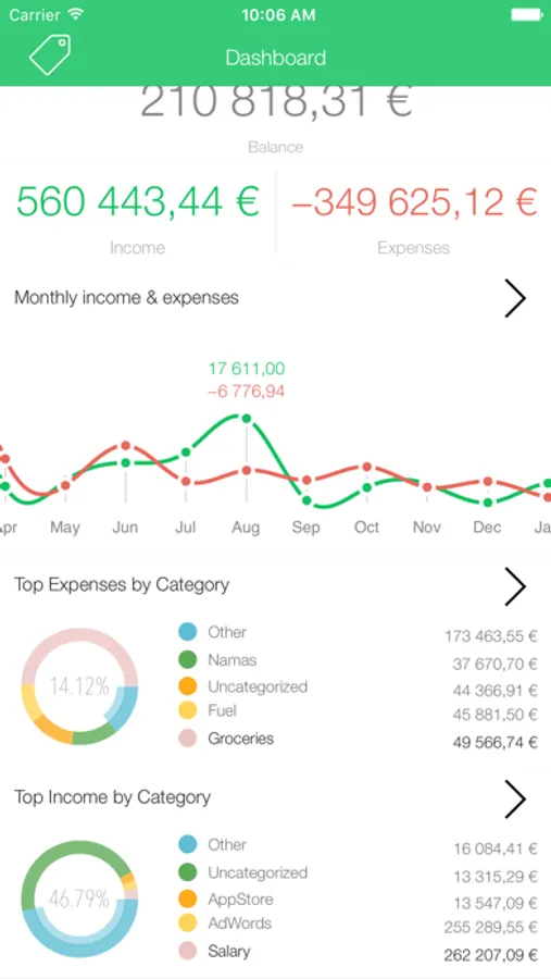 • Timeline view is another outstanding and revolutionary feature within TapToTrack. This handy tools lets you see all incoming and outcoming flows for the days of the year. You can also see your yearly balance and income... it’s simple yet astonishingly effective.