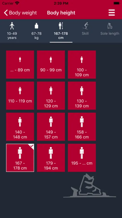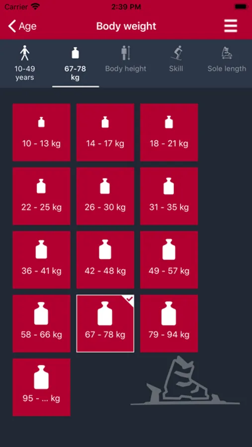 Calculation of the initial setting value (Z-Value, DIN setting) for a ski binding using the weight method (ISO 11088). Body height can be input in centimeters or feet. Body weight can be input in kilograms, pounds, or stones.