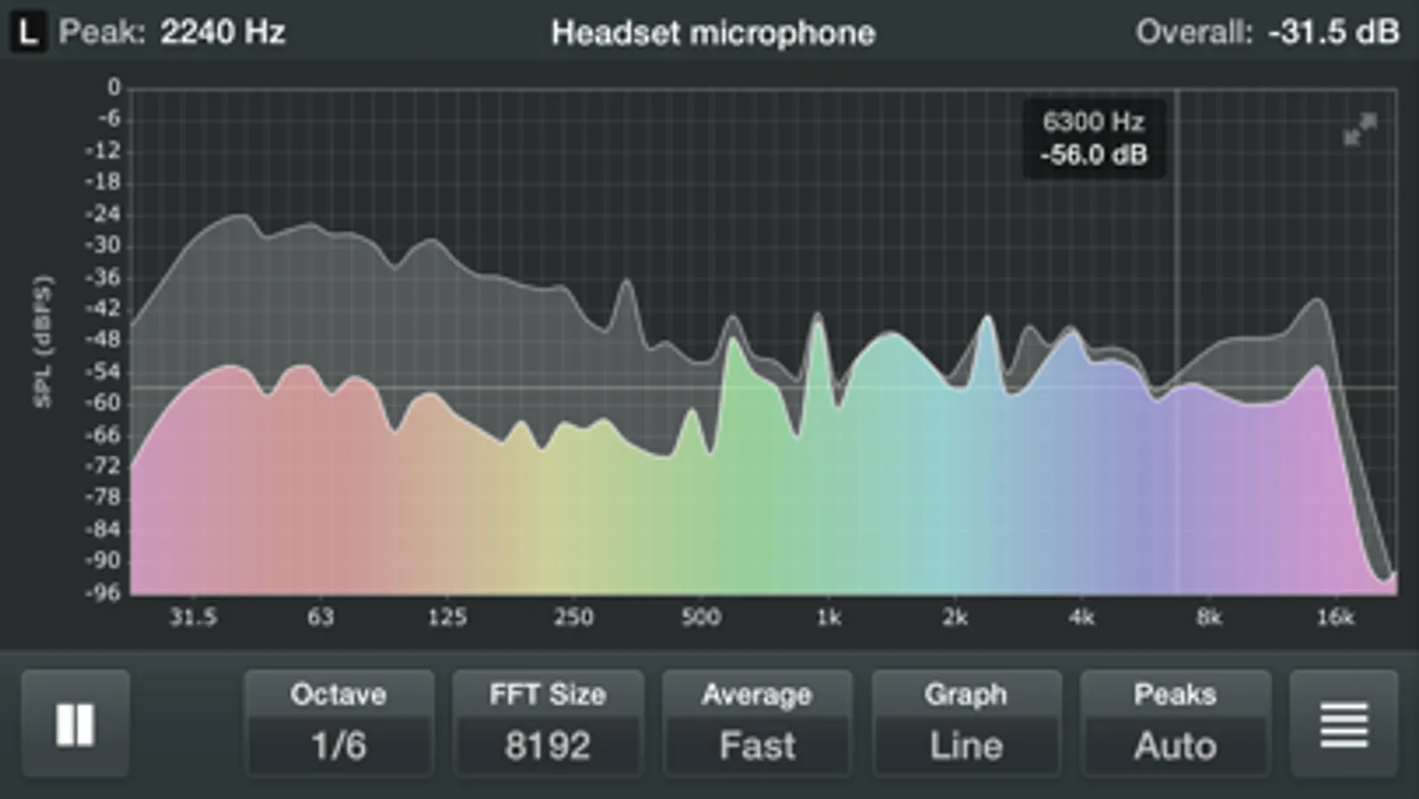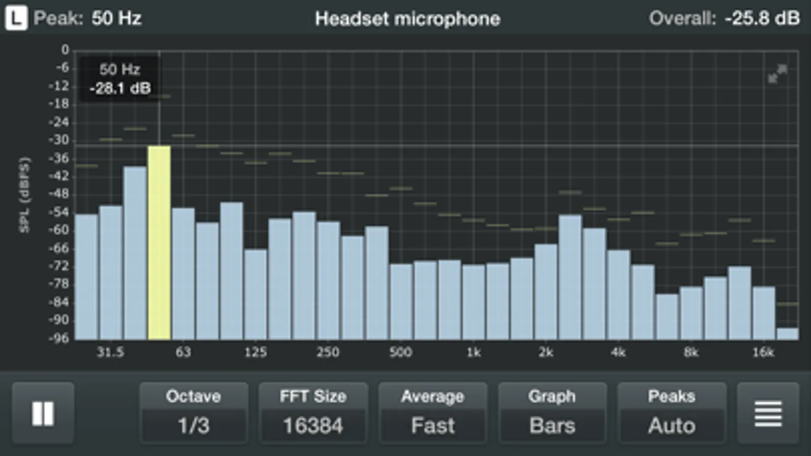 Audio input may be acquired via the built-in microphone or an external measurement microphone. For best results we recommend using a calibrated measurement microphone connected via USB audio interface or iPhone dock connector. This allows for high precision and flat frequency response, as well as for stereo input.