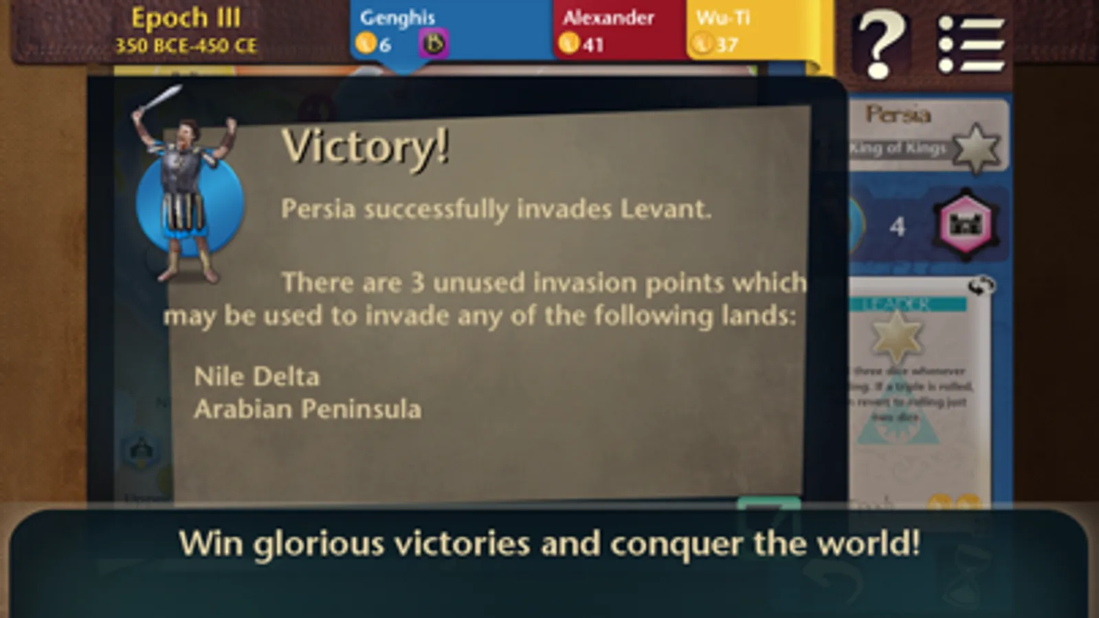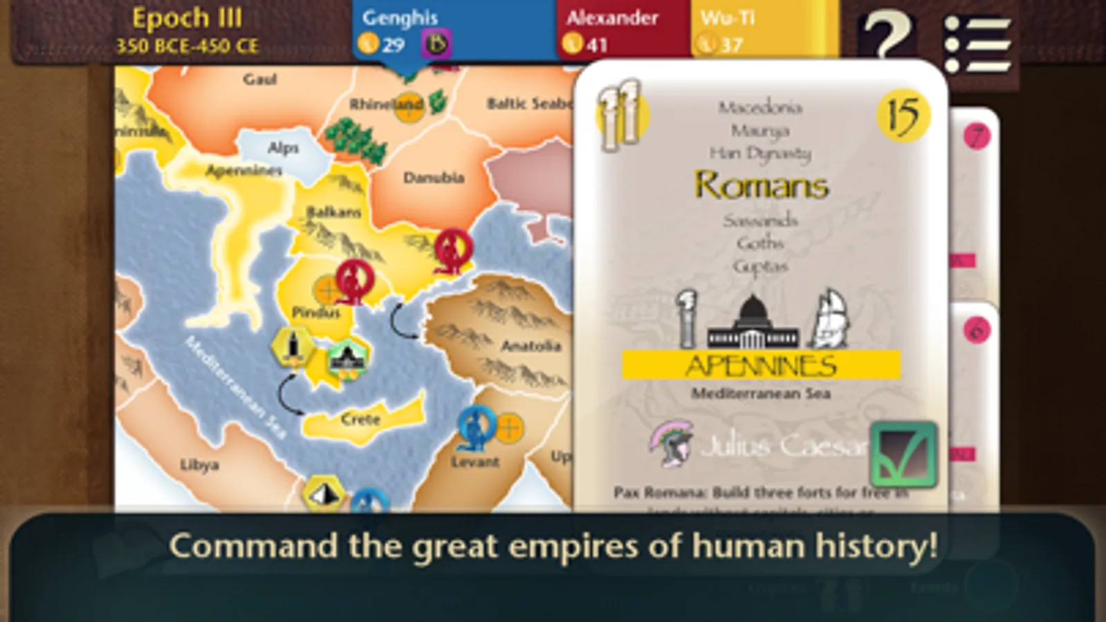 Play as the character of Julius Caesar, Genghis Khan, or Napoleon Bonaparte and command armies through 6 riveting epochs in history, with 42 major empires and 15 minor empires.