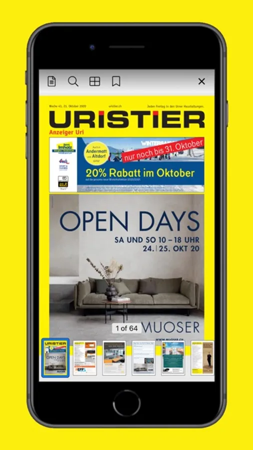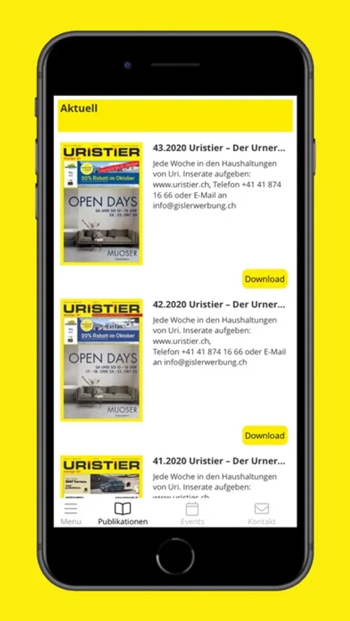 Mit der App des Urner Gratisanzeigers «Uristier» finden Sie jeden Freitag die neusten Inserate und Veranstaltungen auf Ihrem iPhone. Hier können sich die Urnerinnen und Urner orientieren. Was gibt es für aktuelle Events? Was läuft bei den verschiedenen Sportvereinen? Wo werden die besten Preise für den Einkauf am Samstag angeboten? Welches Restaurant hat gerade ein Sonderangebot? Welches Unternehmen bietet etwas Neues an? Der «Uristier» liefert Infos, mit sämtlichen Kleininseraten, Liegenschaftsanzeigen, PR-Inseraten, Rätseln und Veranstaltungen.