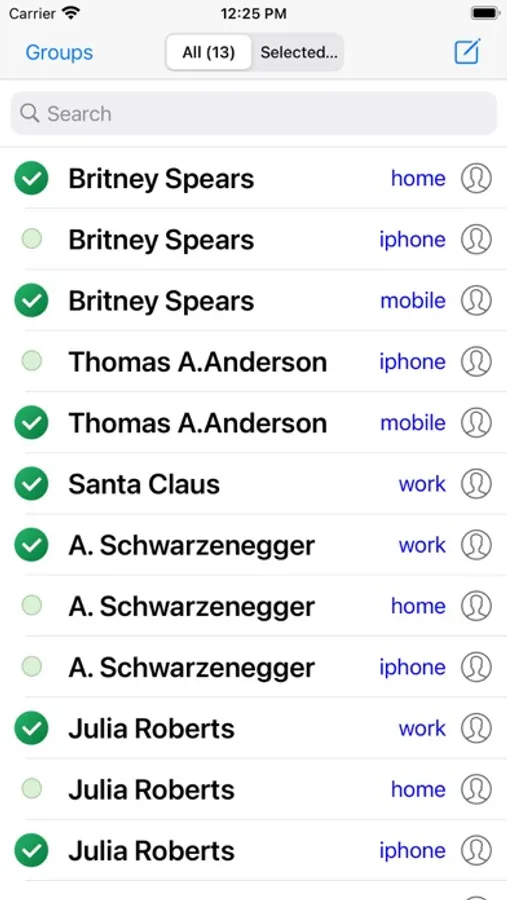 * Contact selection screen showing only contacts including phone numbers.