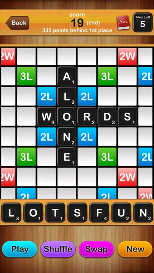 The game board features letter and word multiplier bonus squares scattered throughout; cover multiple bonuses in one play to really rack up the points!