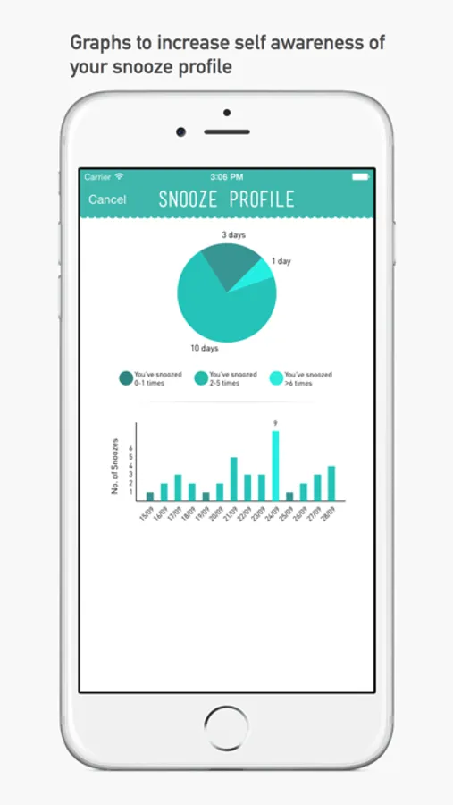 PiggyAlarm is here for you. It helps you keep track of the number of times you have snoozed and the time taken for you to wake up. It also provides a summary of your snooze profile for the past few days.