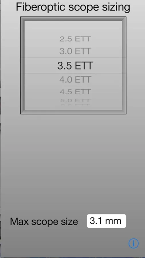 Finally there is an app that tells you the appropriate fiberoptic scope for the endotracheal, double lumen tube or blocker that you want to use. Just select the ETT you want and the app will give you the maximum fiberoptic scope that will fit through. You can use that size or the next size smaller. This app takes all the uncertainty out of a possible emergent situation, and it does it with just one touch. Don't fumble around sticking the scope through all those tubes just to find the right one. Get your answer, fast!