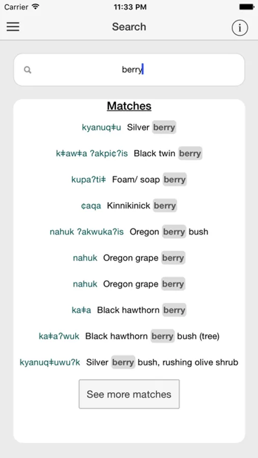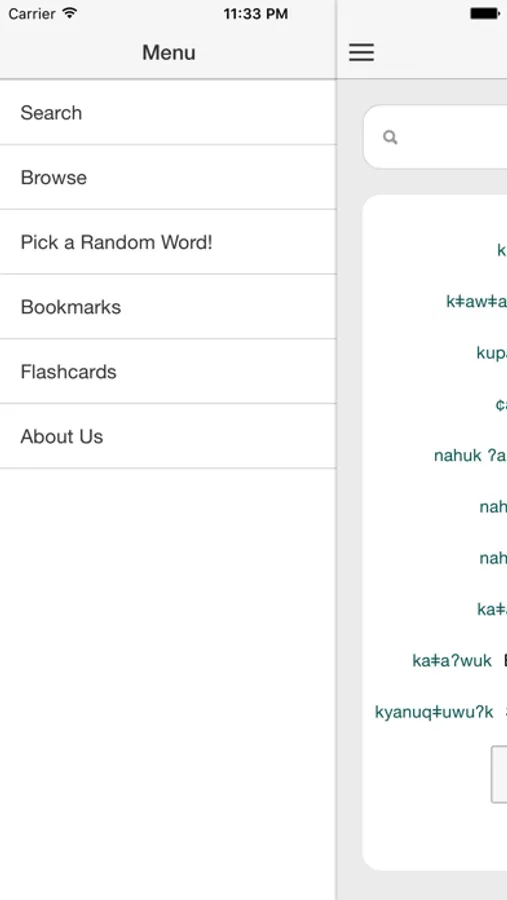 The Ktunaxa language app is a media-rich bilingual dictionary and phrase collection comprised of words and phrases archived at the online Aboriginal language database FirstVoices.com. Word and phrase definitions are illustrated with audio recordings, and images. Users can generate their own thematically organized flashcards and bookmark words or sentences to create their own lists.