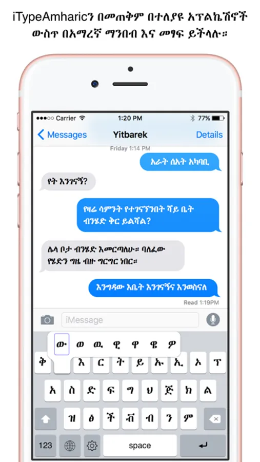iTypeAmharic is a "3rd party" keyboard that can be used in every iOS application. An Amharic font is also included so Amharic text in any app can be displayed. Type Amharic in iMessages, Facebook, Snapchat and more!
