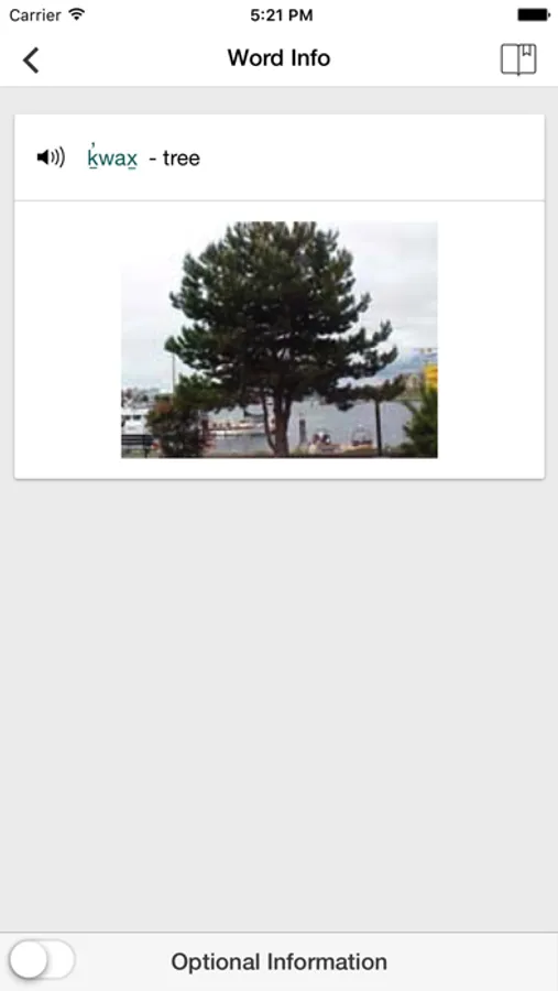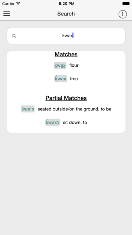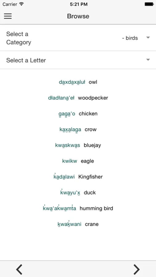 The Kwak'wala language app is a media-rich bilingual dictionary and phrase collection comprised of words and phrases archived at the online Aboriginal language database FirstVoices.com. Word and phrase definitions are illustrated with audio recordings, and images. Users can generate their own thematically organized flashcards and bookmark words or sentences to create their own lists.