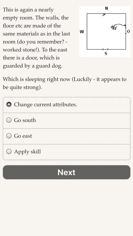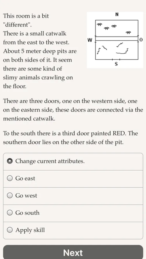 In the style of interactive books, the player is put in a fantasy world. In a maze like dungeon he goes from room to room in the search of the exit. The game itself is text based and all input is done via multiple choice. Nonetheless the game is complex in its own way, it allows solving riddles in more than just one way. The player (YOU), can chose what kind of profession he prefers. Whether to fight or to trick or use to magics. In a retro style you even get hand drawn Pen&Paper like glimpses of your surroundings. If you are stuck - you pray to god for help. Once you DO reach the exit your doings will be evaluated. Can you become a MASTER?